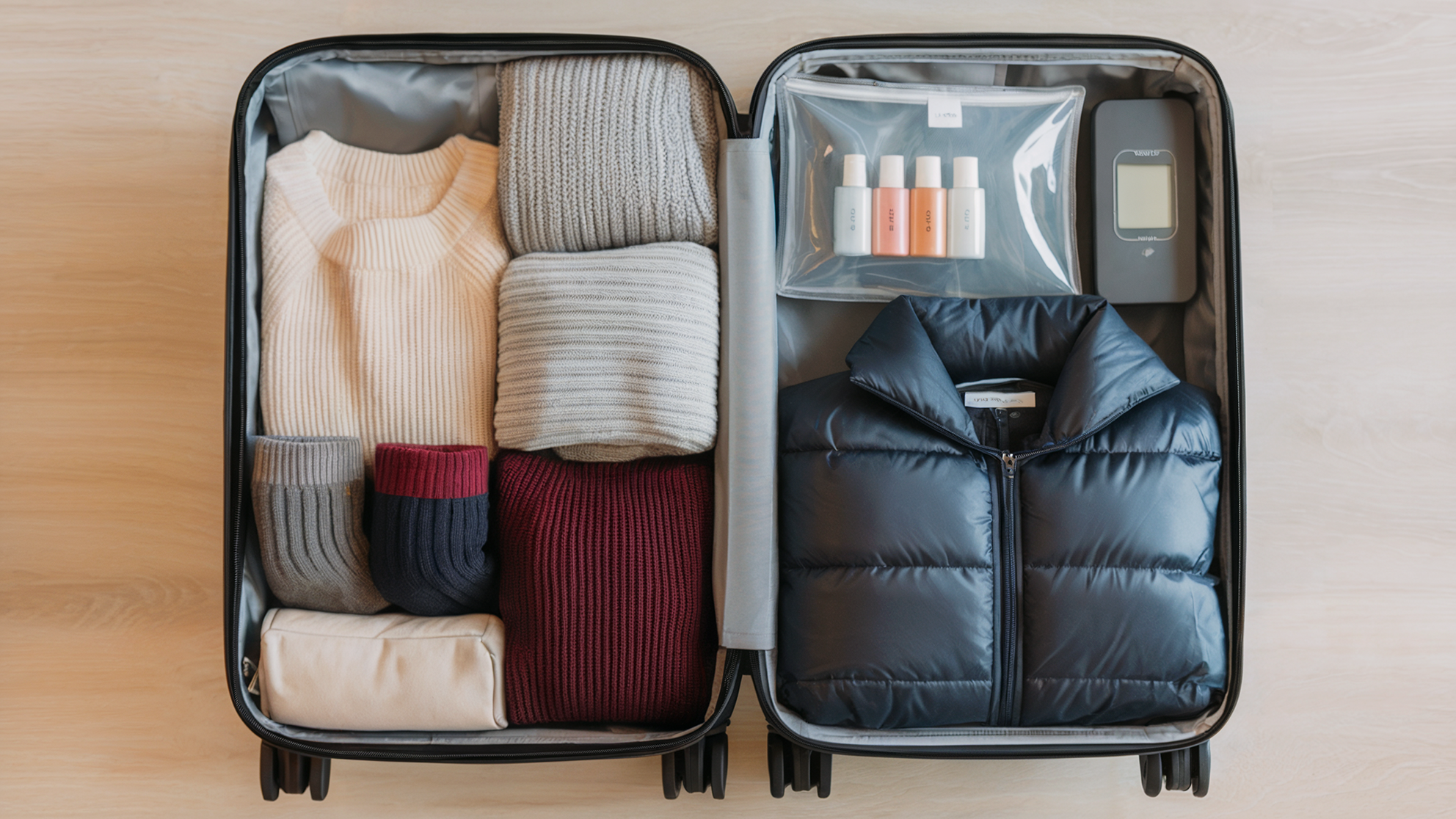เสื้อผ้าบาง—ม้วนเพื่อลดรอยยับ เสื้อหนาหรือโค้ท—ใช้ถุงสุญญากาศ (ระวังน้ำหนักรวม) และแยกชุดแต่ละวันใส่ถุงซิปล็อก หยิบง่าย ประหยัดพื้นที่
